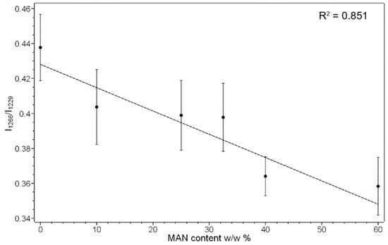 Trend of the I1266/I1229 Raman intensity ratio as a function of the weight gain (i.e., MAN content w/w%) for the silk fibroin fibers grafted with MAN.