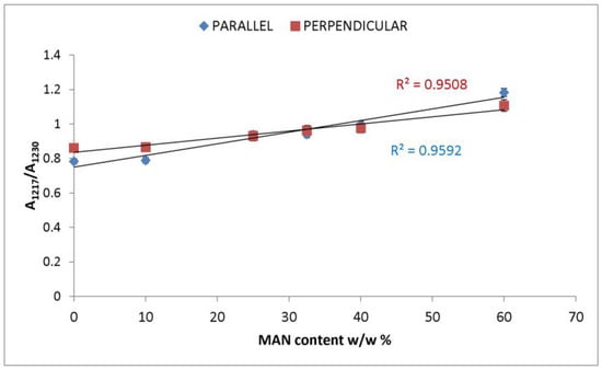 Trend of the IR A1217/A1230 absorbance ratio (obtained from the parallel and perpendicular spectra) as a function of the weight gain (i.e., MAN content w/w%).