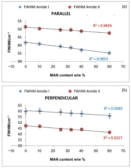 Trend of the FWHM of Amide I and II bands as a function of the weight gain (i.e., MAN content w/w%) in the parallel (a) and perpendicular (b) spectra.