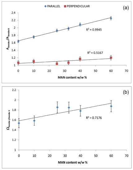 Trend of the IR AAmide I/AAmide II absorbance ratio (a) in the parallel and perpendicular spectra and ΩAmide I/Amide II marker (b) as a function of the MAN content (w/w%).
