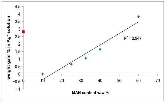 Trend of the % weight gain of the fibers due to Ag+ uptake as a function of the MAN content (w/w%). The silk fibroin control sample is indicated with a red square because it was not used to calculate the regression line.