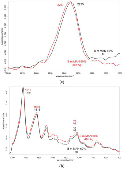In the Amide III range, the A1230/A1260 absorbance ratio decreased in both parallel and perpendicular spectra of the 60% MAN-grafted sample upon ageing (Figure S12, Supplementary Material). The other grafted samples showed less significant changes, as expectable on the basis of their lower silver uptake; the control fibers showed a significant variation of the ratio in the perpendicular spectra, which generally showed more significant changes.