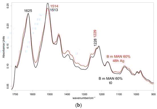 In the parallel spectra of the 60% MAN-grafted fibers, the Amide I and II bands slightly shifted to higher wavenumbers (Figure 10) upon ageing; the former band also broadened, while such behavior was not detected for Amide II (Figure S10, Supplementary Material). EDTA-modified B. mori silk fibroin fibers showed a similar shift towards higher wavenumbers for both Amide I and Amide II bands after binding to Cu2+ and Co2+ ions [46]. In the perpendicular spectra, both Amide I and II bands broadened upon silver uptake (Figure 11 and Figure S11, Supplementary Material). The other grafted samples showed less significant changes, as expectable on the basis of their lower silver uptake (Figures S10 and S11, Supplementary Material); the silk fibroin control fibers showed a significant broadening of Amide I in the parallel spectra (Figure S10a, Supplementary Material), according to their high silver uptake.