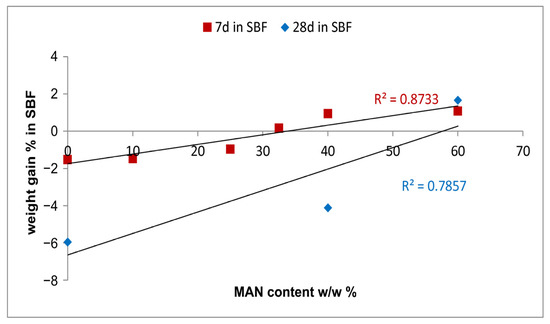 Trend of the % weight gain of the fibers upon ageing in SBF for 7 and 28 days as a function of the MAN content (w/w%).