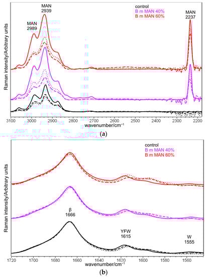 The 1555 cm−1 band is attributed to the indole ring vibration of tryptophan: the linear decrease of the I1555/IAmide I Raman intensity ratio with MAN content may confirm the involvement of Trp residues in grafting (Figure S5, Supplementary Material).