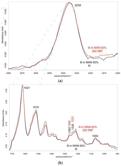IR spectra recorded in the parallel orientation on the 60% MAN-grafted fibers before and after ageing for 28 days in SBF in the 2280–2200 cm−1 (a) and 1720–900 cm−1 (b) spectral ranges.