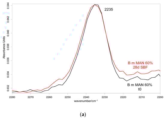 Raman spectroscopy could not detect any nucleation of an inorganic phase even on the samples having positive weight gains, since the technique is more sensitive to the bulk of the material [30]. However, it proved suitable to determine whether the samples’ weight variation was associated with a mass loss due to the grafting agent. This was possible thanks to the previously mentioned Raman I2237/IAmide I and I703/IAmide I intensity ratios (Figure 4), which were found to be highly correlated with weight gain. Figures S17 and S18, Supplementary Material, report the trends of the I2237/IAmide I and I703/IAmide I intensity ratios before and after immersion of the fibers in the SBF solution for 7 and 28 days. The regression lines reported in Figure 4 allowed us to estimate the MAN content % of the grafted samples before and after the bioactivity tests in SBF (Table 1). Both intensity ratios revealed that none of the samples showed any significant variation in the MAN content % after 7 days of immersion in SBF; therefore, at this stage, no loss of the grafted polymer occurred. On the contrary, both ratios agreed about a significant loss of the grafting agent after 28 days of immersion in the SBF solution: both grafted samples showed a reduction of the above-mentioned intensity ratios by about 12–14% (Figures S17 and S18, Supplementary Material), which corresponded to an effective reduction of MAN content by about 5–7% (Table 1).