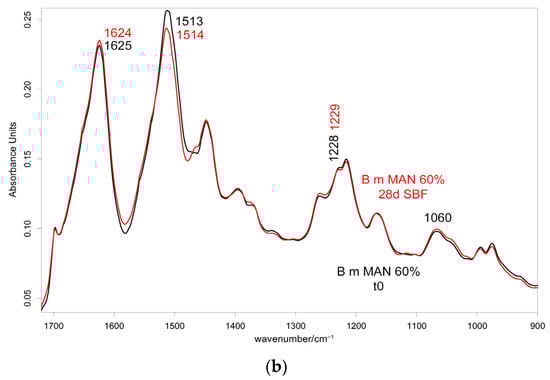 At IR spectroscopy, the MAN content remained constant upon ageing for 28 days, as revealed by the constancy of the A1217/A1230 absorbance ratio (Figure S24, Supplementary Material). This result could appear in contrast with the Raman findings. In fact, it must be recalled that the two techniques have different sampling areas: Raman spectroscopy is sensitive to the sample bulk, while IR spectroscopy is sensitive to the sample surface. Therefore, IR spectroscopy revealed that no MAN release in the ageing medium occurred from the sample surface, while the MAN content of the sample bulk was affected by the ageing in SBF.