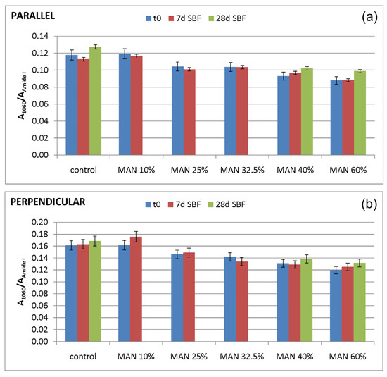 Values of the A1060/AAmide I absorbance ratio as obtained from the IR spectra recorded in the parallel (a) and perpendicular (b) orientations on the samples under study (control = untreated fibers, and MAN-grafted fibers containing different amounts of MAN) before (t0) and after ageing of the fibers in SBF.
