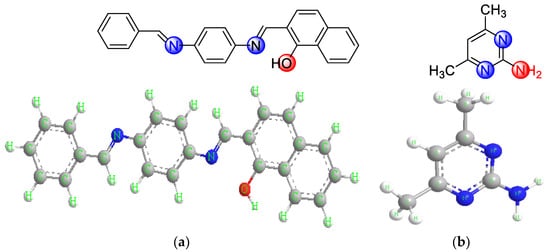 Structure of the ligands. (a) 2-((E)-((4-(((E) benzylidene)amino)phenyl) imino)methyl)-naphthalene-1-ol. (b) 2-amino-4,6-dimethyl pyrimidine.