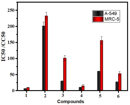 Cancer is a type of malignant disease in which a group of cells appears to grow in an irregular pattern. The only way to treat this is through surgical intervention or chemotherapy, both of which have negative side effects. Although platinum-based complexes such as cis-platin have been used to treat cancer, it is not effective, so in vitro tests for complexes of manganese, cobalt, copper, chromium, and palladium were conducted against two cancer lines, respectively. A-549 and MRC-5 cells were used as test subjects for the cytotoxic activity of Schiff base and aminopyrimidyl complexes in the concentration range of 0–500 (g/mL). Results are provided in Figure 9, which shows the IC50 and CC50 values for each compound (Table 5). According to cytotoxicity results, all tested complexes showed strong cytotoxicity against A-549 cancer cells (IC50 = 10.97–201.86 μg/µL) and strong cytotoxicity against MRC-5 cancer cells (CC50 = 15.41–233.01 μg/µL). Copper(II) complex showed the highest cytotoxicity effect with an IC50 value of 10.97 μg/µL, followed by palladium(II) complex with an IC50 value of 26.54 μg/µL and then Cobalt(II) complex with an IC50 value of 29.94 μg/µL and then chromium(III) complex with IC50 value 61.46 μg/µL and then manganese (II) complex with IC50 value 201.86 μg/µL in case of A-549 cancer cells. Copper(II) complex showed the highest cytotoxicity effect with a CC50 value of 15.41 μg/µL, followed by palladium(II) complex with a CC50 value of 53 μM, cobalt(II) complex with a CC50 value of 101.72 μM, then chromium(III) complex with a CC50 value 157.65 μg/µL, then manganese(II) complex with CC50 value 233.01 μg/µL in case of MRC-5 cancer cells. As the concentration of the complexes increased, cell viability decreased (Figure 10).
