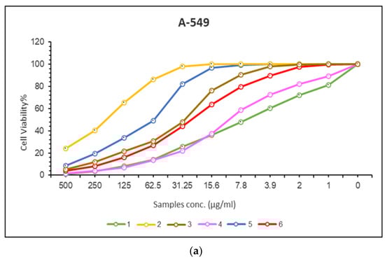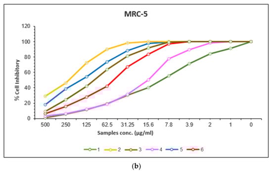 (a) A-549. The dose-response curves of the cytotoxicity of compounds (1–6). Cells were exposed to different concentrations of the compounds for 72 h. Cell viability was determined by a colorimetric method. (b) MRC-5cell lines. The dose-response curves of the cytotoxicity of compounds (1–6) Cells were exposed to different concentrations of the compounds for 72 h. Cell viability was determined by a colorimetric method.