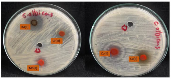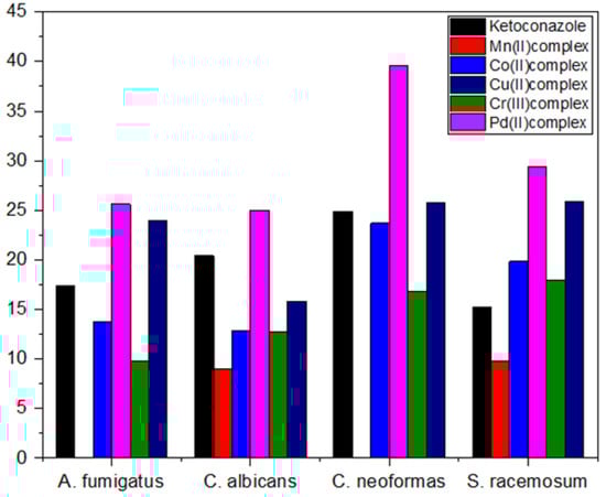 The data shown in Table 6 showed excellent activity against fungal strains, specifically against the fungal strain Cryptococcus nanoforms. We note that the growth inhibition zone ranged between 9 and 40. We also note that many mineral complexes showed higher activity than the control sample compared to the lower antifungal activity of the free ligand or the previous complexes [10]. We found that palladium(II) and copper(II) complexes are the most active against fungi which showed impressive activity, while the manganese(II) complex is the least effective (Figure 11, Figure 12 and Figure 13). The complexes were arranged according to their activity against fungal strains as follows: Pd(II) > Cu(II) > Co(II) > Cr(III) > Mn(II).
