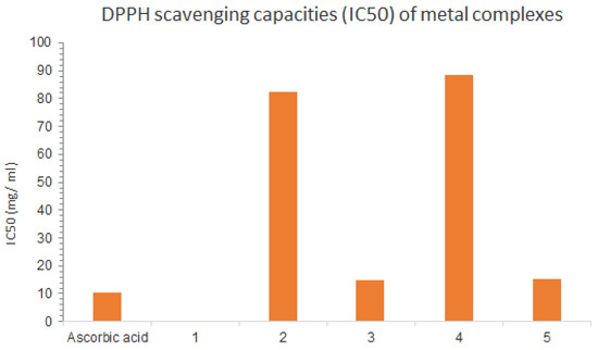 The application of antioxidants is one of the most straightforward means to protect these biomolecules from oxidative stress. Many assays are available for the determination of antioxidant potential in vitro. These assays are based on the reduction of stable radicals (DPPH). DPPH test is one of the most commonly performed antioxidant assays with natural and (semi)synthetic biologically active compounds. Although it has no direct physiological relevance, this assay allows quick comparison of the free radical scavenging potential of new derivatives as this activity has been published for many compounds [32]. We have therefore tested our mixed ligand complexes of Schiff bases and aminopyrimidyl derivatives for DPPH scavenging and compared their activity with the activity of the parent compounds, that is, Cu(II) and Pd(II) complexes showing high activity, Co(II) and Cr(III) complexes showing moderate activity, and all of them showing less activity when compared to the standard (ascorbic acid). Under these experimental conditions, the Mn(II) complexes demonstrated weak antioxidant activity. The IC50 values for all the collectors were determined and compared with the standard as listed in the Table 8 and Figure 17.