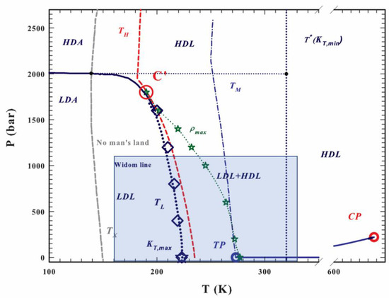 In Figure 1 (adapted from Mallamace et al. [57]), the qualitative phase diagram of amorphous water is shown, with various states and phase transition lines. As mentioned above, in our analysis we concentrate on the region shaded in blue (temperatures between 160 and 360 K; pressures between 0 and 1000 bar (~100 MPa)).