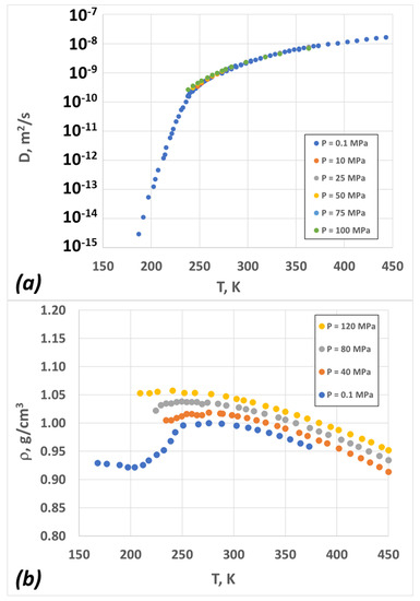 To test our models, we used the published experimental data from multiple sources; these data were collected using standard techniques and instruments and were found to reproduce one another fairly well when the measurements were done under similar environmental conditions (i.e., similar pressures and temperatures). The self-diffusion data were obtained from a series of different experiments from the literature. In detail, at atmospheric pressure, we considered data from Yoshida et al. [69] in the 303–450 K temperature range, from Simpson and Carr [70] for 273 K < T < 373 K, from Price et al. [71] for 238 K < T < 298 K, and from Xu et al. [72] for 180 K < T < 262 K. The first three works consider the nuclear magnetic resonance (NMR) pulsed-field-gradient spin-echo method, allowing the evaluation of the self-diffusion coefficient from the trend of the spin-echo decay as a function of the intensity (or duration) of the perturbing magnetic gradient pulse [73]. In contrast, Xu et al. [72] used a pulsed laser for unfreeze ice and perform the measurement on liquid water by studying the growth rate of crystalline ice and applying the well-known Wilson-Frenkel model [74]. At higher pressure, we considered the self-diffusion data published by Prielmeier et al. [75], including data in the higher-temperature regime (T > 273 K) measured by Weingärtner [76] and by Tyrrell and Harris [77]. All of them used the NMR pulsed-field-gradient spin-echo method.