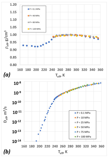 Overall, the proposed simple model successfully describes both the equation of state and the transport properties of liquid water in a wide temperature (~180–360 K) and pressure (~0 to 100 MPa) range. The framework, in principle, is flexible enough to allow the model to be extended to higher pressures closer to the LLCP. Another, more challenging problem is extending the proposed approach to integrate the crystalline phase (“ice”), at least in its most common form. These will be topics for future research.