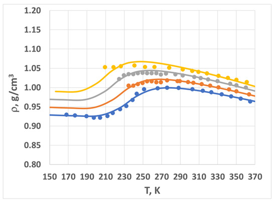 In Figure 4, we plot the density vs. temperature data and the model fit for multiple pressures. The ambient pressure data (blue circles) are plotted against the model’s best fit (blue line). The model correctly captured the initial density decrease (160–210 K), followed by the sharp increase (210–275 K) and then another decrease (for temperatures greater than 275 K). We then applied the scaling rules to calculate the density–temperature curves for several other pressures, represented by the orange (P = 40 MPa), grey (P = 80 MPa), and gold (P = 120 MPa) circles and lines.
