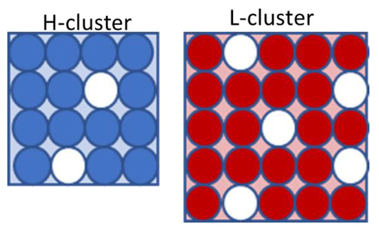 We adopted the two-state SL-TS2 formalism that combines the description of the density and relaxation time of an amorphous liquid or glassy material (see Ginzburg et al. [45,47,48]). Within this model, water is considered as an ensemble comprised of two types of “clusters” (or cooperatively rearranging regions (CRRs)) (see Figure 7). The lower-temperature state, L (right panel), is characterized by lower density, i.e., higher volume, while the higher-temperature state, H (left panel), has higher density and lower volume (note that the word “state” here refers not to the macroscopic thermodynamic phase, but to the microscopic local structure). The Gibbs free energy of a system of N clusters, including X being in the L-state and (N-X) being in the H-state, is written as follows: