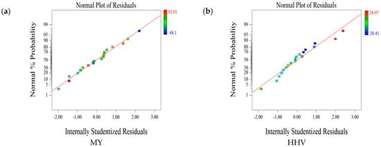 Figure 1 shows the residual analysis of HHV, MY, EY, and AC, which can be used to check the reliability of the mathematical model. The experimental values of the vast majority of the four dependent variables were close to the theoretical values, and many points coincided with the straight line, indicating a good agreement between the model and the experimental data. Therefore, bias in the results was negligible.