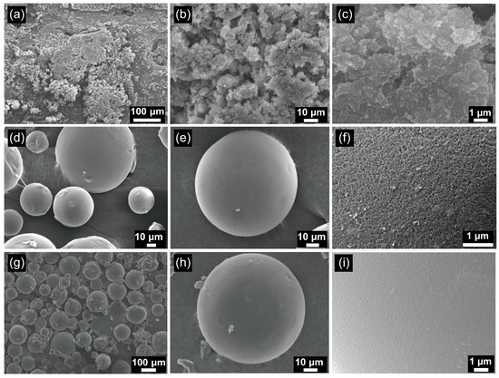 Figure 1a–c show the morphology of the PIL–NH2–GA–Lac composites. The PIL (1)–NH2 composites did not have regular spheroids, nor were they observed to have a uniform surface or pore structure. Figure 1d–f indicate that PIL (2)–NH2 had a spherical structure with a size distribution between 15 and 100 μm, and the surface of its microsphere was rough, as shown in Figure 1f. In addition, PIL (2)–NH2–GA–Lac (Figure 1g–i) still retained a spherical structure, while its surface was smoother compared with that of the pristine support (PIL (2)–NH2). This may have been due to the coating that formed after the immobilization of the laccase.