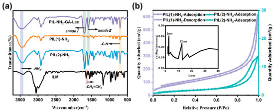 FTIR spectra of PIL–NH2 and PIL–NH2–GA–Lac (a). Nitrogen adsorption–desorption isotherms and BJH pore size distributions of PIL–NH2 (b).