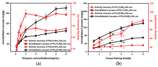 Next, two important immobilized laccase parameters, the initial laccase concentration and the cross-linking time, were investigated. The number of amino-functionalized PIL particles determines the number of laccases. As shown in Figure 3a, with a higher initial concentration, more laccase was able to be immobilized. In addition, the immobilized efficiencies of laccase corresponded to the nature of PILs, such as their specific surface area and pore size. A higher specific surface area and larger pore size can facilitate the entry of enzymes into the support to achieve a higher enzyme immobilization [40]. When the initial concentration of laccase was below 1 mg/mL, both the immobilized laccase and activity recovery increased. It should be noted that when the concentration was 1 mg/mL, the maximum laccase activity recovery was obtained (82%, 0.34 u/mg; the specific activity of free laccase was 0.41 u/mg under the same test conditions). However, the activity recovery did not increase when the concentration was over 1 mg/mL, which might have been due to the fact that an aggregation of the excessive laccase in the pores occurred or that a multilayer structure formed on the surface of the PILs.