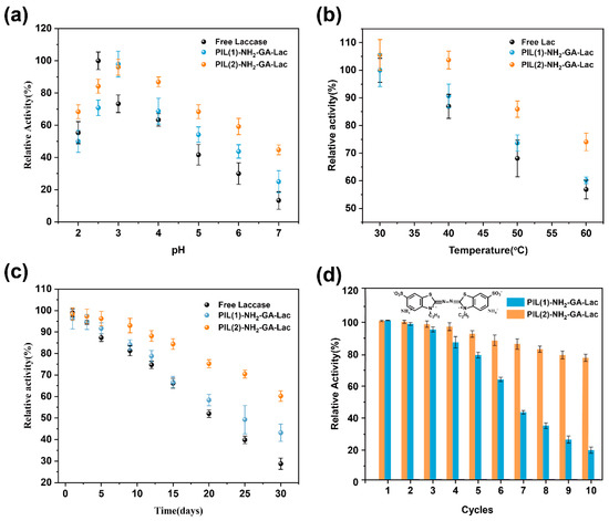 Figure 4b shows that the relative activities of both the free and immobilized laccase were strongly temperature-dependent. The thermal stability of PIL–NH2–GA–Lac was improved, and its activity decreased more slowly than that of free laccase. In particular, PIL (2)–NH2–GA–Lac maintained more than 70% activity at 60 °C. This may be attributed to the PIL supports’ providing covalently attached sites and confined space for the laccase, as well as the inactive active center’s being preserved by its binding with the ligand, resulting in the decreased formation of the thermo-unfolded enzyme. Therefore, higher temperatures (above 40 °C) were required to break down the intermolecular interactions and to inactivate the enzyme [46]. In addition, some reports have proved that PILs have a good heat insulation effect, so when the temperature of the external solution rises, the surface and internal temperature of the support will be relatively low, which protects the laccase from being inactivated by high temperatures [47].