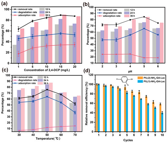 Next, the catalytic potential of PIL (2)–NH2–GA–Lac was investigated. Many previous studies have shown that various process parameters may significantly affect the removal of harmful pollutants by enzymes [52]. Therefore, after evaluating the stability and reusability of immobilized laccase, it was crucial to determine the effects of various process conditions (e.g., pH, temperature, and substrate concentration) on its efficiency and the optimal conditions for the effective removal of phenolic contaminants. In Figure 5a–c, the bar represents the efficiency of phenol removal over time (12–36 h). The dot plot represents the removal, degradation, and adsorption of 2,4-DCP by the immobilized enzyme within a certain time range. The recycling efficiency of 2,4-DCP removal by the immobilized enzyme was also studied, as shown in Figure 5d.
