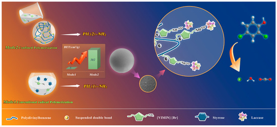 Laccase was supplied by Chengdu Huaxia Chemical (0.5 U mg−1). Glutaraldehyde (25% in H2O, v/v) was supplied by Sigma Aldrich (St. Louis, MO, USA). Divinyl benzene (DVB), toluene and 2,2′-azo ratio (2-methylpropanitrile) (AIBN, 98%) were provided by Tianjin Damao Chemical Reagent Co., Ltd. (Tianjin, China). Polyvinyl alcohol purchased from Jiangsu Aikang Biomedical Research and Development Co., Ltd. (PVA). N-vinylimidazole and 3-Bromopropylamine hydrobromide were purchased from Meryer. AIBN was used after fresh recrystallization. 2,2′-Azbis (3-ethylbenzothiazoline-6-sulfonic acid) (ABTS), sodium citrate dehydration, FeCl3, AlCl3, CrCl3, ZnCl2, and MgCl2 were purchased from Aladdin Chemical Co., Ltd. Except for AIBN, which needs recrystallization, and DVB, which needs extraction, other solvents and reagents were analytical grade and were able to be used without further purification.