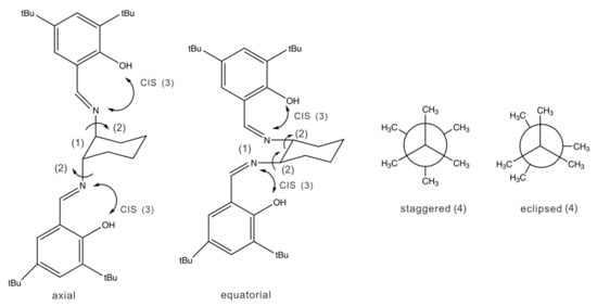 Possible conformations of salen-chxn: (1) the axial and equatorial conformations at cyclohexane; (2) the rotatable N-Chexane bonds are indicated by small arrows; (3) the OH orientation direction pointing to N=C (shown) or away (not shown); (4) the subtle staggered and eclipsed conformations of the tBu groups are also shown on the right side. The eclipsed CH3 groups are offset slightly for easy viewing. The tBu groups of the two aromatic branches can take on the staggered–staggered, staggered–eclipsed, and eclipsed–eclipsed conformations.