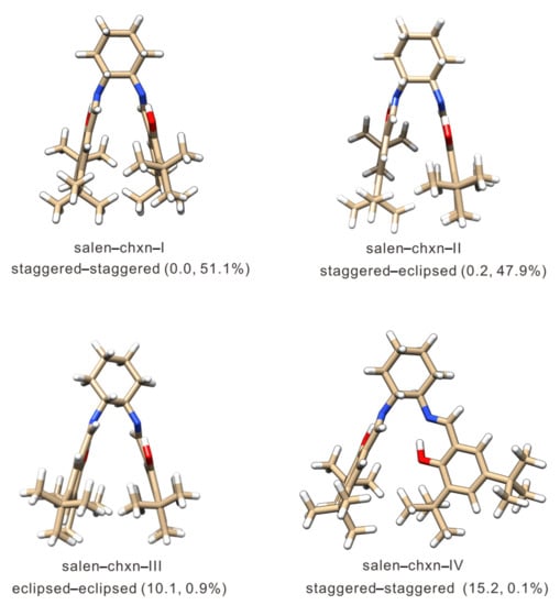 Optimized geometries of the four low energy salen-chxn ligand conformers identified by the CREST search and optimized at the B3LYP-D3BJ/def2-TZVP level of theory with the PCM of CDCl3. The relative free energies in kJ mol−1 and the Boltzmann percentage abundances at 298 K are provided in the brackets. The blue and red colors represent the nitrogen and oxygen atoms, respectively, whereas the white color is for the hydrogen atoms, and the carbon frame is in the ginger color.