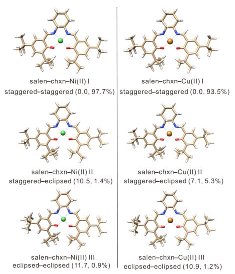 For the salen-chxn-Ni(II) and salen-chxn-Cu(II) complexes, the same conformational searches as described above were conducted. However, the coordination with the metal centers makes these systems more rigid than the salen-chxn ligand, and only nine candidates were identified. The geometry optimizations were performed at the B3LYP-D3BJ/6-311++G(d,p) level and the combined B3LYP-D3BJ/def2-TZVP (for all atoms except the metal atom) + LANL2DZ (Los Alamos National Laboratory 2 double-ζ [52], for Ni and Cu) level. The DFT calculations led to three conformers associated with the different tBu arrangements. Consistent results were obtained at both levels of theory. The optimized geometries of the three conformers for Ni and three for Cu obtained are summarized in Figure 3, with their free energies and Boltzmann factors at 298 K.