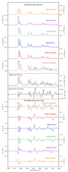 The simulated individual IR and VCD spectra of the four most stable salen-chxn conformers and the related Boltzmann averaged IR and VCD spectra at the B3LYP-D3BJ/def2-TZVP/PCM(CDCl3) level of theory at 298 K. The experimental and empirically weighted IR and VCD spectra are also provided. The experimental units are on the right side. The main IR and VCD band features are labelled “a” to “t” to aid the comparison.