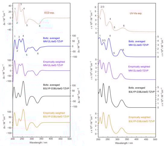 Comparison of the experimental and theoretical UV-Vis and ECD spectra of salen-chxn in acetonitrile solution. The first 200 electronic states were included in the calculations at the two levels of theory indicated. For the empirically weighted spectra, we used the same weights derived from the IR and VCD comparison. The main UV-Vis and ECD bands are labelled as “1” to “6” to aid the comparison.
