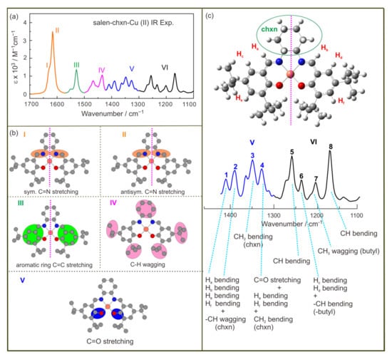 (a) The IR spectrum of salen-chxn-Cu(II) in the 1700–1100 cm−1 region is divided into six parts from I to VI. (b) The molecular parts related to I to V are coloured. (c) The main vibrational modes of salen-chxn-Cu(II) in the 1450–1100 cm−1 region. The main IR bands in the 1100–1450 cm−1 region are labelled as “1” to “8” to aid the discussion.