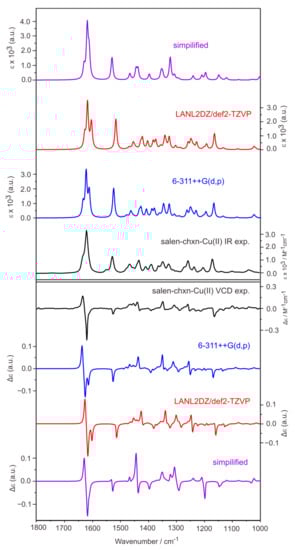 Comparison of the experimental IR (top) and VCD (bottom) spectra of salen-chxn-Cu(II) with the corresponding calculated spectra in CDCl3 solution. The levels of theory used are B3LYP-D3BJ/6-311++G(d,p) and B3LYP-D3BJ/def2-TZVP+LANL2DZ(for Cu) with the PCM of chloroform. The simplified calculations were done by replacing tBu with an H atom.