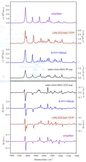 Another goal of the current study is to explore the possibility of speeding up the calculations by replacing each tBu group with an H atom and verifying if the simplified calculations can theoretically capture all major experimental IR and VCD features. The simplified calculation was performed at the B3LYP-D3BJ/6-31G(d,p) (for C and H atoms) + 6-311++G(2d,p) (for Ni or Cu, N and O atoms) level. The results are also presented in Figure 8 and Figure 9 for the Cu(II) and Ni(II) complexes, respectively. It is interesting to note that major IR and VCD features in the above 1500 cm−1 region were well reproduced. In contrast, those medium strength bands in the below 1500 cm−1 region for the Ni(II) and Cu(II) complexes were not captured accurately. This is not surprising because these specific bands below 1500 cm−1 can be largely assigned to the CH3 motions of the tBu functional groups as well as the CHs associated with the cyclohexane ring. Therefore, if one’s main focus is the absolute configuration of the metal complexes, it is enough to do the simplified calculations. On the other hand, the complete calculations allow detailed assignment of all visible vibrational and VCD bands, greatly boosting the confidence of conformational identification.