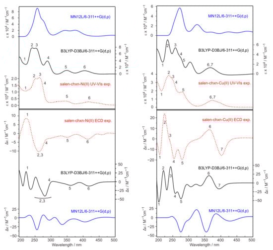 Comparison of the experimental and simulated UV-Vis (top) and ECD (bottom) spectra of salen-chxn-Ni(II) and salen-chxn-Cu(II) at two different levels of theory. In total, 250 electronic states were included in the calculation. The main UV-Vis and ECD bands of salen-chxn-Ni(II) and salen-chxn-Cu(II) are labelled as “1” to “6” and “1” to “7”, respectively, to aid the comparison.