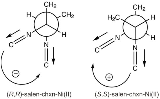 The situation improves with the two metal complexes. First of all, both of their observed experimental VCD features are dominated by a negative VCD couplet in the above 1580 cm−1 region where the lower wavenumber band shows a negative sign. Second, the bisignate VCD couplets of salen-chxn-Ni(II) and -Cu(II) are related to the symmetric and antisymmetric C=N stretches, whose vibrational electric transition moment directions are well defined, as shown in Figure 11. Second, only one main conformer was identified for each metal complex, or at least the minor tBu arrangements do not affect the relative orientation of the two aromatic branches, thanks to the rigidity introduced by the coordination bonding to a central metal atom. Following the VCD exciton chirality method proposed by Taniguchi and Monde [59], the method indeed predicted a negative Cotton effect for (R,R)-salen-chxn-Ni(II) (Figure 11), marked by a counter-clockwise rotation of the C=N groups. The same scheme can be applied to salen-chxn-Cu(II).