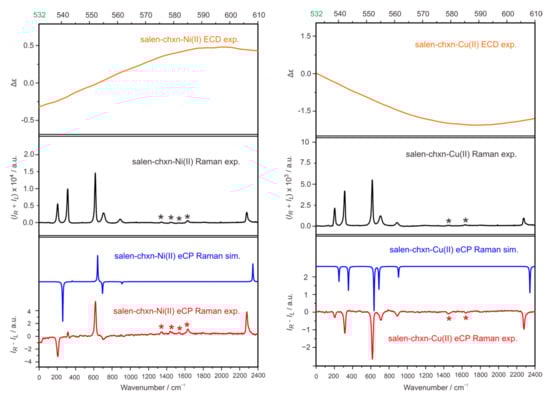 (Top): experimental ECD spectra from 532 nm to 610 nm of salen-chxn-Ni(II) and salen-chxn-Cu(II). (Middle): experimental Raman spectra of the two metal complexes. (Bottom): the comparison of the experimental and simulated eCP-Raman spectra of the two metal complexes. The solute bands are indicated with asterisk.