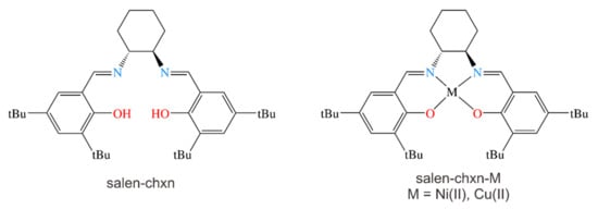The molecular formula of the (R,R)-N,N′-Bis(3,5-di-tert-butylsalicylidene)-1,2-cyclohexanediamine (salen-chxn) ligand and its Ni(II) and Cu(II) complexes, denoted as salen-chxn-Ni(II) and salen-chxn-Cu(II), respectively. tBu indicates the tertbutyl group.