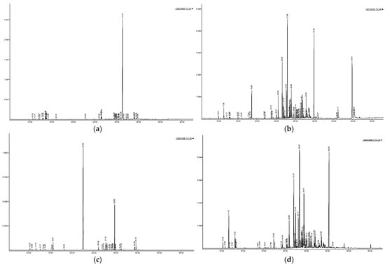 The GC-MS spectrums of the EOs of four Asarum species. (a) Asarum cordifolium, (b) Asarum geophilum, (c) Asarum yentunensis, (d) Asarum splendens.