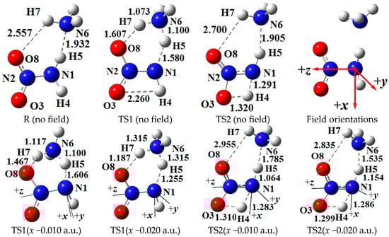 Selected structures of the reactant (R), transition states (TS) in the different external electric field strengths and orientations (including those in the absence of field) at the MP2/6-311++G(2d,p) level (geometric parameters are in Å). The “reaction axes” are N6→H7→O8, N1→H5→N6, and N1→H4→O3.