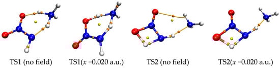 It is well known that the unrestricted single reference methods give rise to spin contamination when applied to open-shell systems since the unrestricted Hartree–Fock wave function is not an eigenfunction of the total spin operator, i.e., the expectation value ˂S2> may not be equal to S(S+1), leading to an inaccurate energy. For the restricted open-shell Hartree–Fock calculations with the right ˂S2>, the unphysical results are often generated due to artificially ruined spin polarization. Therefore, it is necessary to use multireference methods for highly spin-contaminated systems with an inherently multireference nature, especially for the transition state [47,48]. For the open-shell systems calculated using the MP2 and CCSD methods, although the treatment of the electron correlation should lower spin contamination, the spin contamination also occurs at the correlated level [49]. Furthermore, although the CCSD method significantly outperforms MP2 in describing systems with a strongly spin-contaminated reference because the cluster single excitation operator partly accounts for the orbital relaxation effects [50,51,52], CCSD(T), they are often rather sensitive to the spin contamination of the reference [53,54]. In this work, for the single-point energy calculation for the reactants and transition states for the hydrogen exchanges in TS1 and TS2 at the UMP2/6-311++G(2d,p) and UCCSD(T)/6-311++G(2d,p)//MP2/6-311++G(2d,p) levels, we obtained <S2> ≈ 0.0 (vs. expected S(S+1) = 0) in the different external electric field strengths and orientations, including those in the absence of field. Therefore, the impact of spin contamination and multireference character on the initiation reactions in NH2NO2∙∙∙NH3 in the external electric field, as well as in the absence of field, can be ignored.