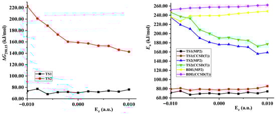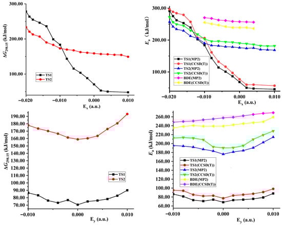 Both the energies of TS1 and reactant decrease synchronously (become more negative) with the increase of the external electric field strength in z-directions, so the changes of the activation energies are not obvious (see Figure 3 and Table S1). Although the energies of TS1 decrease and those of the reactant increase along the +x- and y-direction, their changes are slight, so the decreased barrier heights are also not obvious. With the field strength of 0.010 or −0.010 a.u., the change of the barrier compared with that in no field is no more than 25.0 kJ/mol in the field along the z-, +x-, or y-axis directions at two levels of theory. However, since the energies of TS1 increase greatly while those of the reactant decrease, significant increased barrier heights are found along the −x-direction. With the field strengths from 0.000 to −0.020 a.u., the barrier heights soar from 68.6 to 291.3 kJ/mol at the MP2/6-311++G(2d,p) level. The change is up to more than 100.0 or 220.0 kJ/mol with the field strength of −0.010 or −0.020 a.u., accompanied by a relative value of more than 140.0% or 300.0%. In general, the change of the barrier compared with that in no field is no more than 15.0 kJ/mol with the field strength of −0.010 or +0.010 a.u. [34,35,36,44].