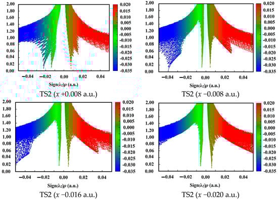 Plots of the RDG versus the electron density multiplied by the sign of the second Hessian eigenvalue (λ2) for TS1 and TS2. Green indicates strong attractive interaction, blue-brown indicates weak attractive interaction or vdW interaction, and red indicates steric effect.