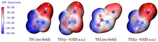 The ESP shows characteristics of electron density distribution by means of the local parameters and global statistical quantities, and it can be used to evaluate the possibility of chemical reaction [64,65]. For example, for an electron-rich atom, the more notable local negative surface ESPs (Vs−), the more significant the electron sufficiency within the localized region prone to the electrophilic reaction becomes. According to global parameters, the larger the variance or , the greater possibility of the nucleophilic or electrophilic reaction becomes [66,67,68,69]. In order to further reveal the essence of the sharp increase of the barriers of TS1 under the field along −x-orientation, the surface electrostatic potentials involving TS1 are shown in Figure 5 and Table 2.