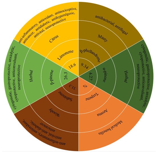 Other important compounds making up the composition of kaffir lime essential oil are β-phellandrene, α-pinene, myrcene, and p-cymene, belonging to the group of monoterpene hydrocarbons. The results are consistent with the results obtained by Baccati et al. [30], although with a slight predominance of sabinene over β-pinene in our case. As already mentioned, the difference may be due to the geographical origin of the fruit, the degree of ripeness, or the method of extracting essential oils. The content of many terpenes with several bioactive properties makes kaffir lime oil a mixture with many health benefits (Figure 1).