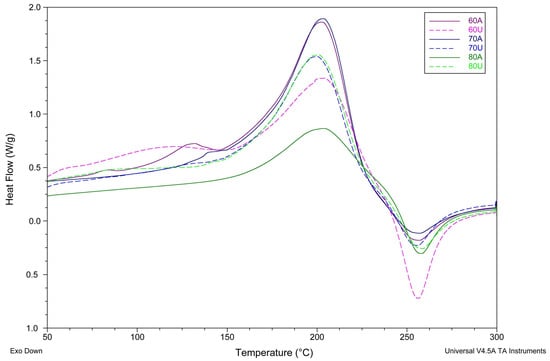 Because the endothermic phenomenon is assigned to water evaporation [41], a higher melting temperature and melting enthalpy meant more energy was needed to absolutely remove water. There is no clearly visible trend associated with the enthalpy value. The endothermic peak starts above 90 °C, which is connected to water evaporation. In samples extracted at lower temperatures without the addition of ultrasounds, one lower peak (at 130 °C for 60A and 140 °C for 70A—Figure 4) can be seen. For these two samples (60A and 70A), enthalpy is similar and above 300 J/g. Samples after using ultrasound for the extraction have no additional peak and enthalpy is lower between 191.1 J/g and 276.5 J/g for 60U, 80U, and 70U, in order.